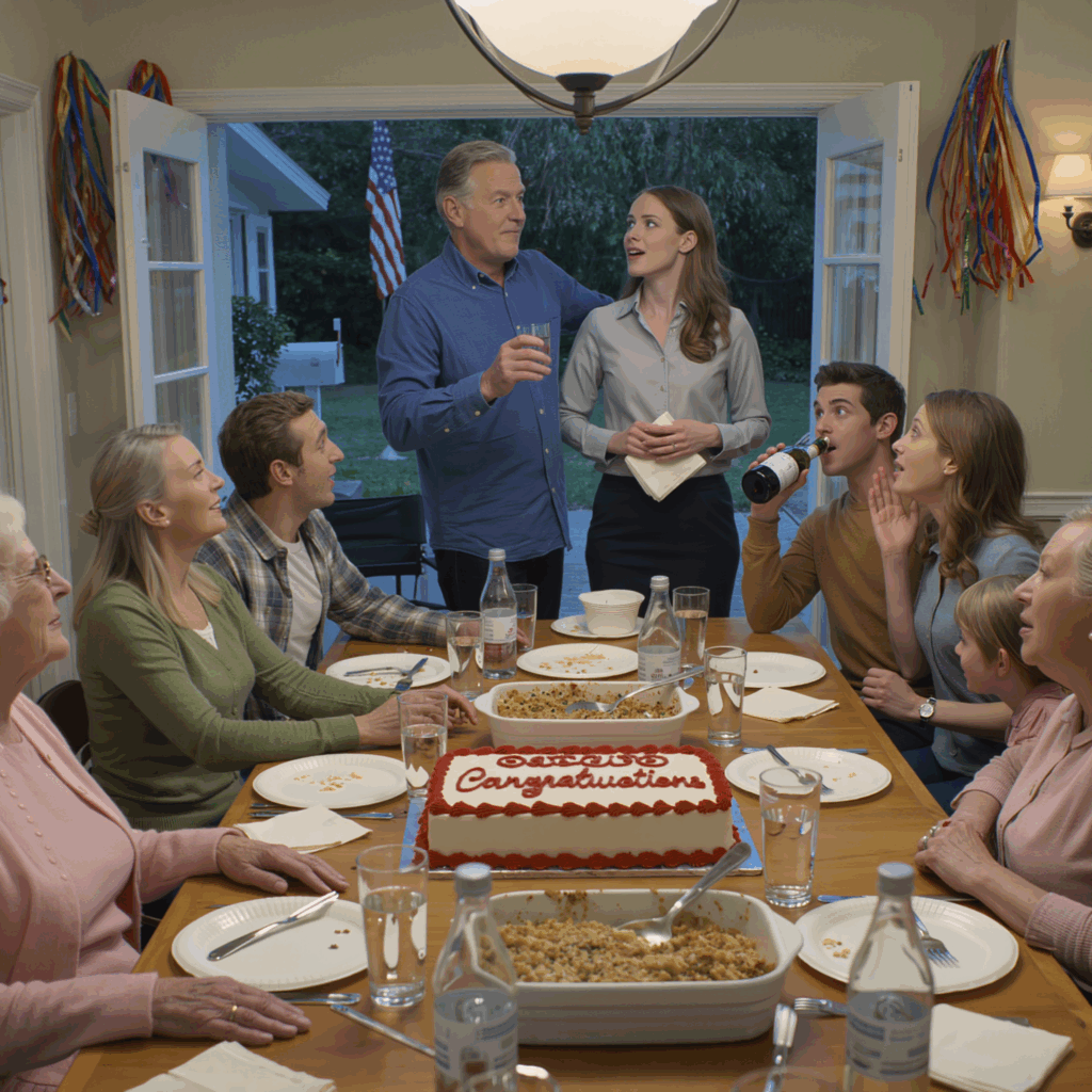 Sunday came and the house looked like a Hallmark card—streamers, extra chairs, paper napkins folded into earnest little fans. People laughed and sipped wine and complimented Mom’s cooking. The cake waited in the kitchen like a punchline.